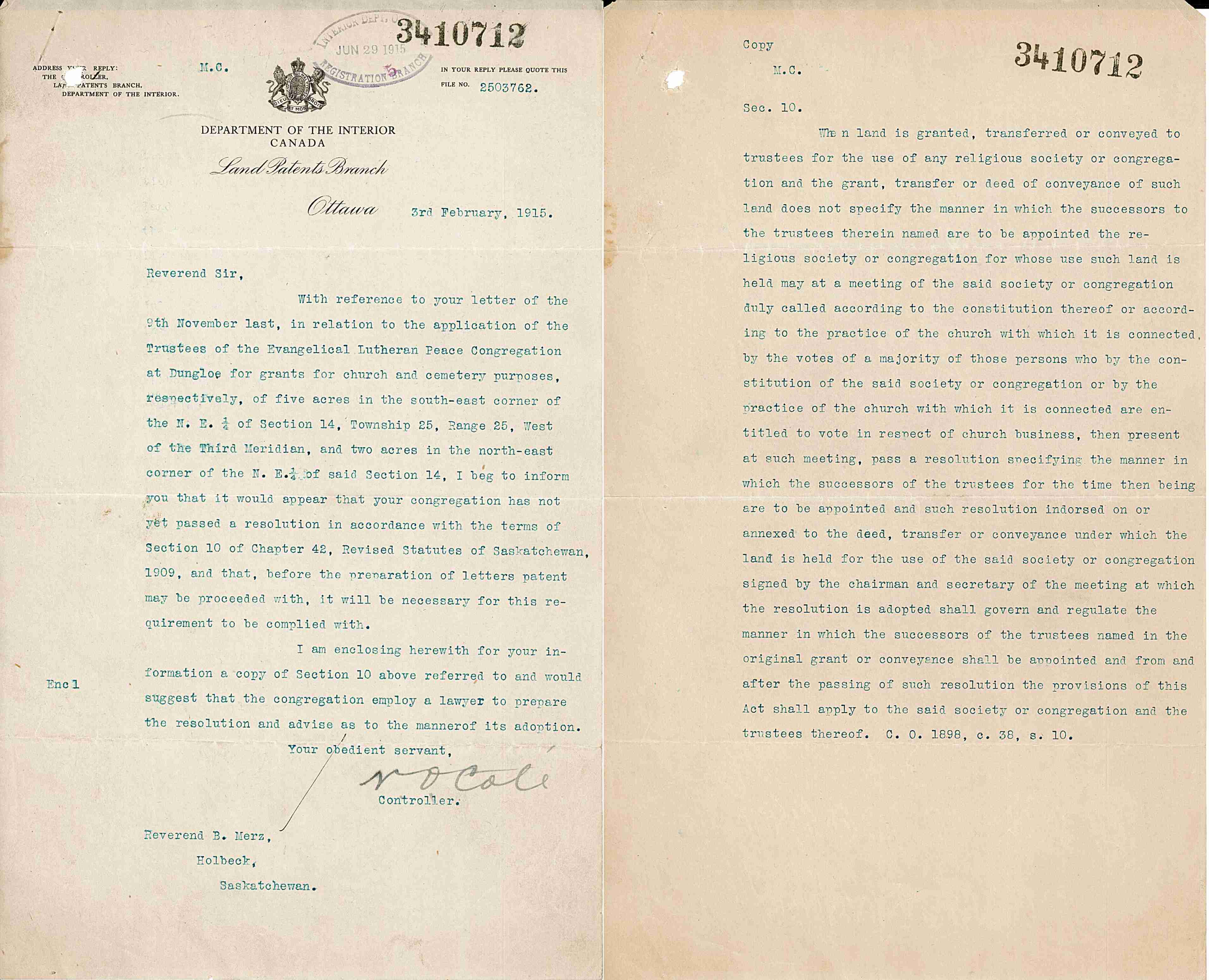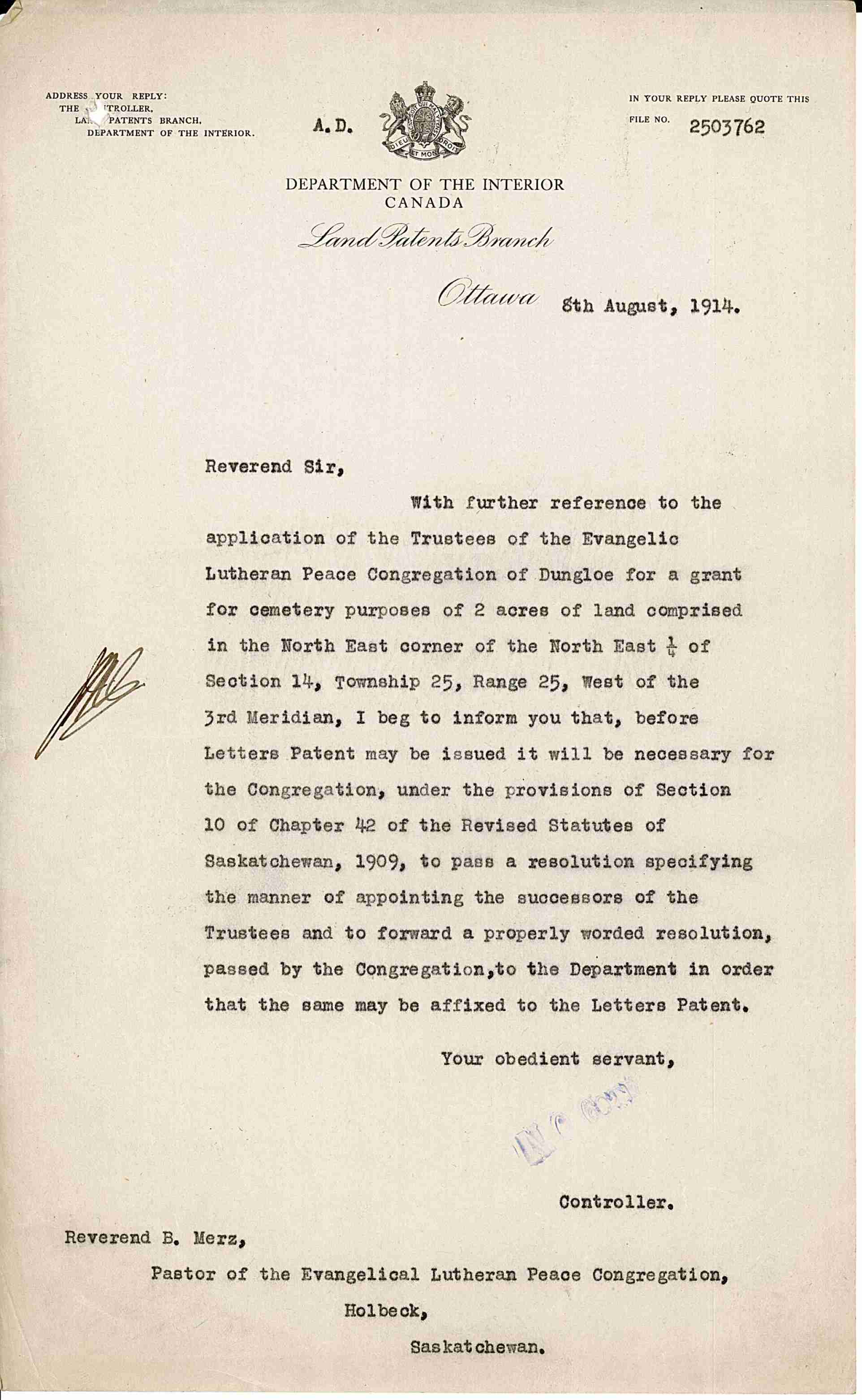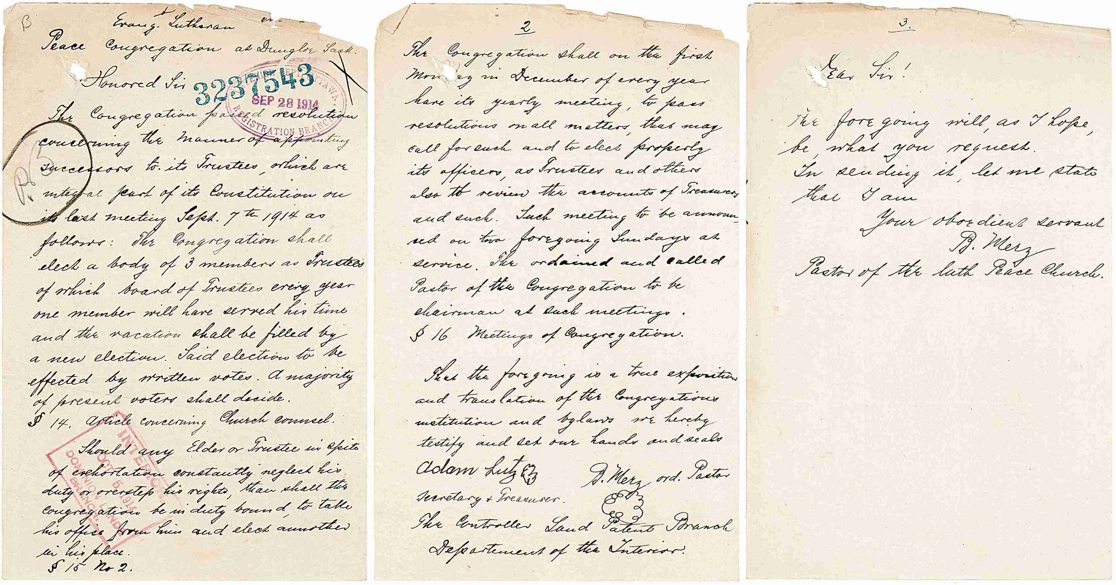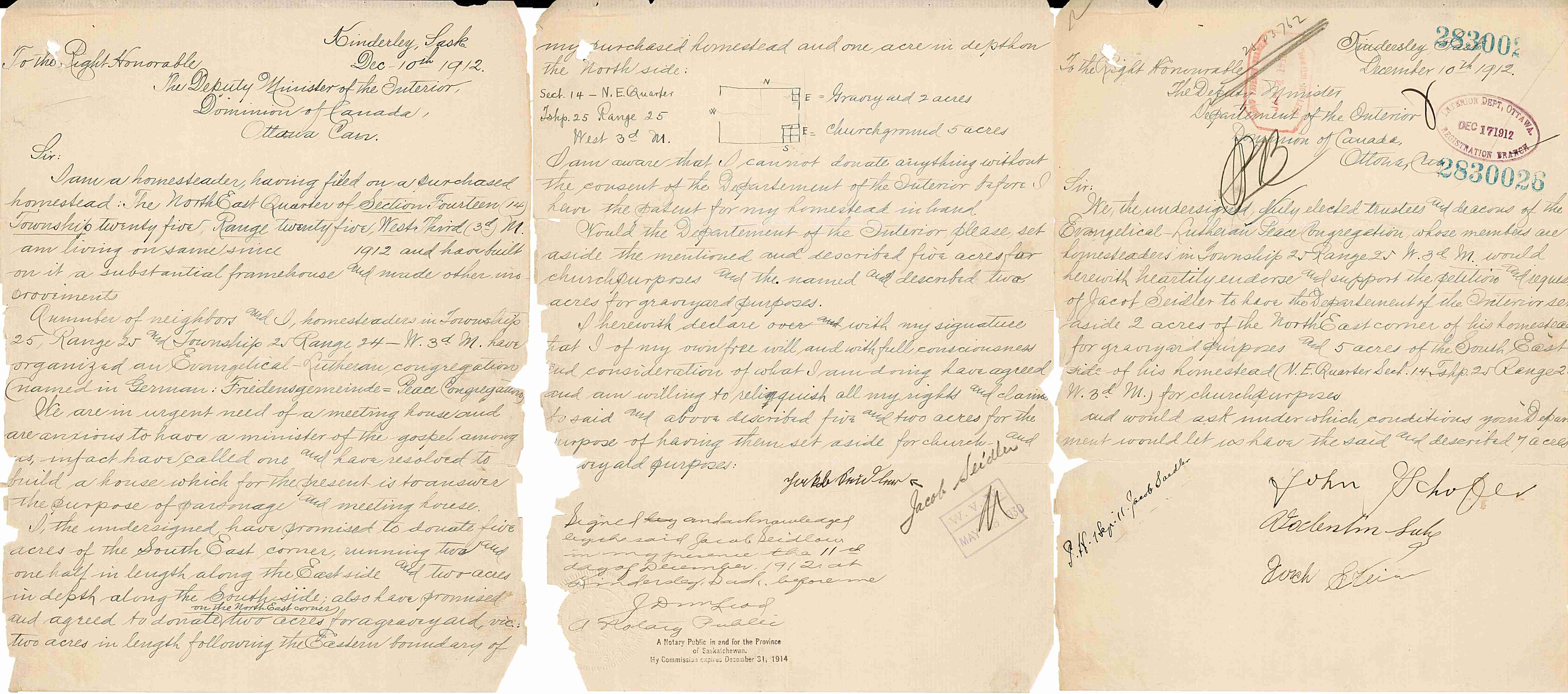 1912-Dec-10: Jacob Seidler & the Evangelical-Lutheran Peace Congregation wrote to the Department of the Interior