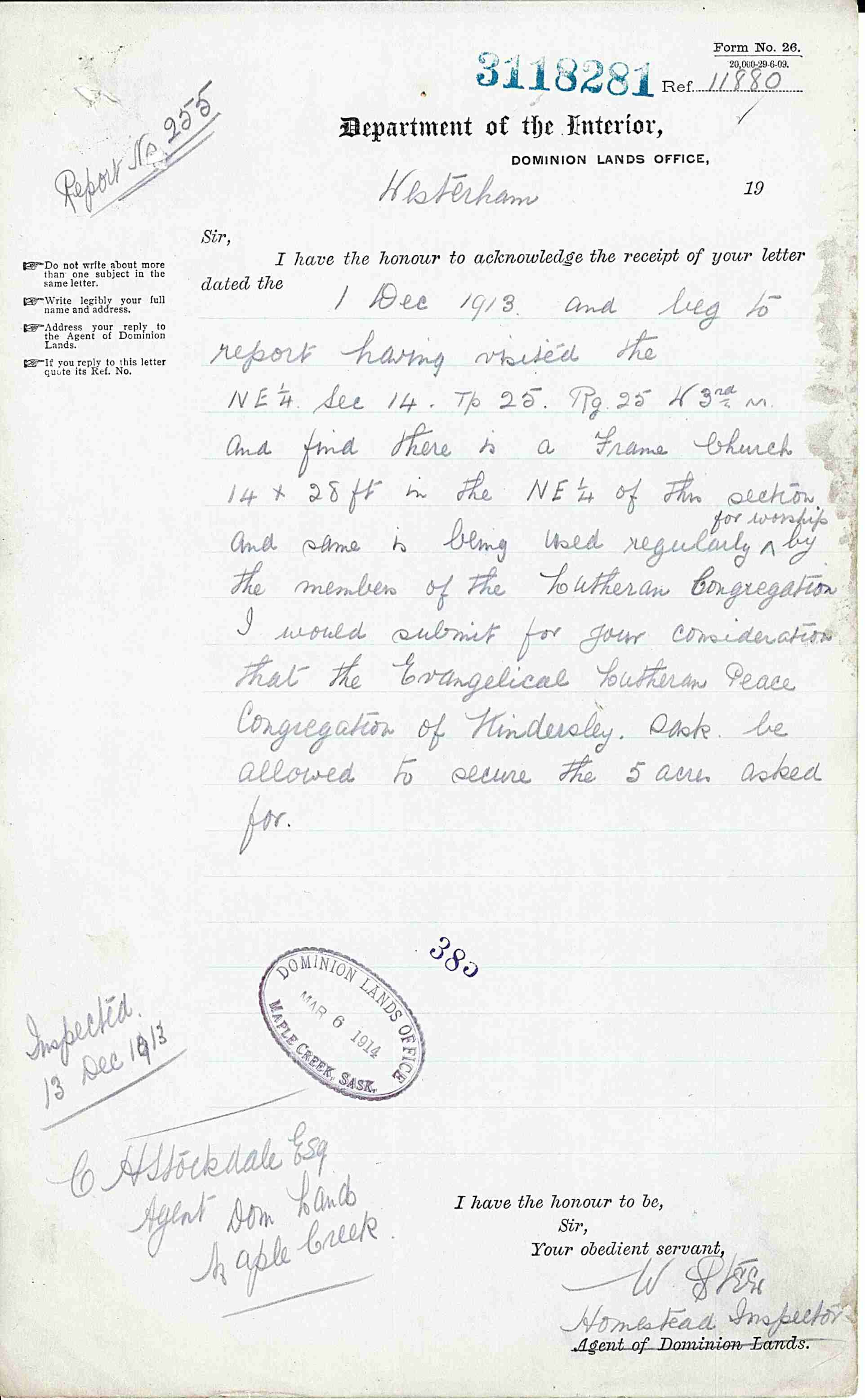1913-Dec-13: Homestead Inspector to Department of the Interior