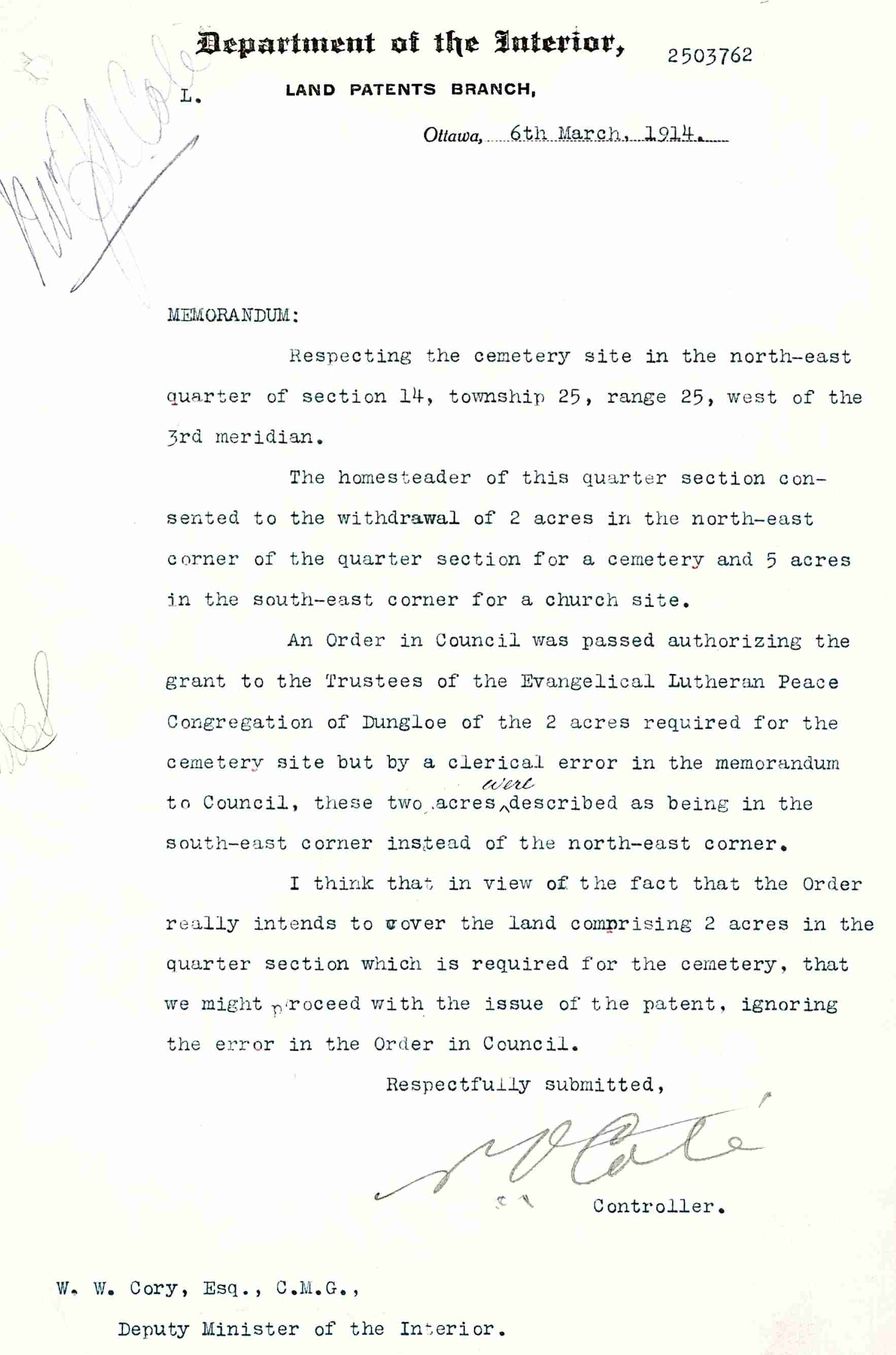 1916-Jan-14: Land Patent Grant issued for cemetery & church