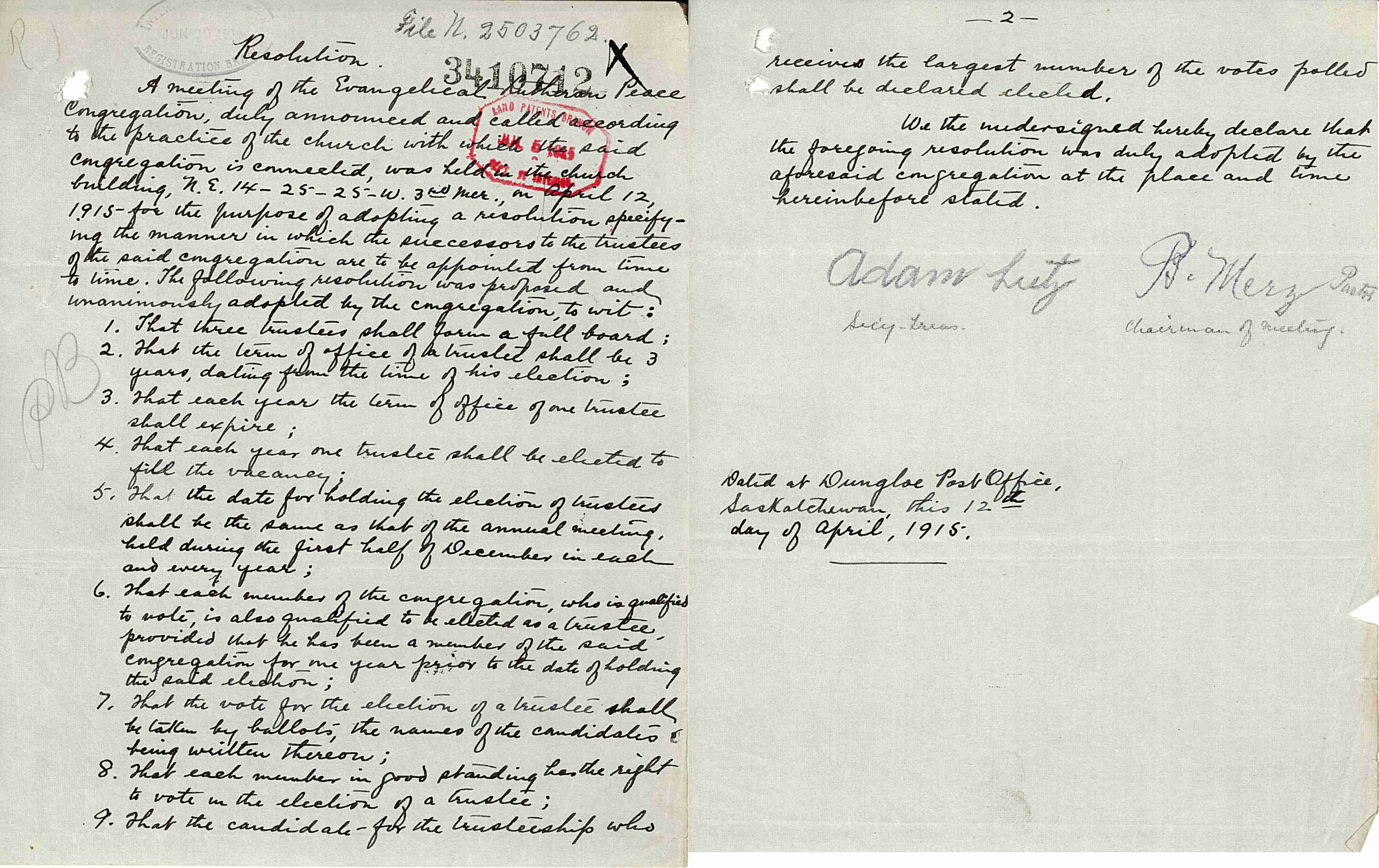 1915-Apr-12: Congregation's Resolution regarding election of Trustees.