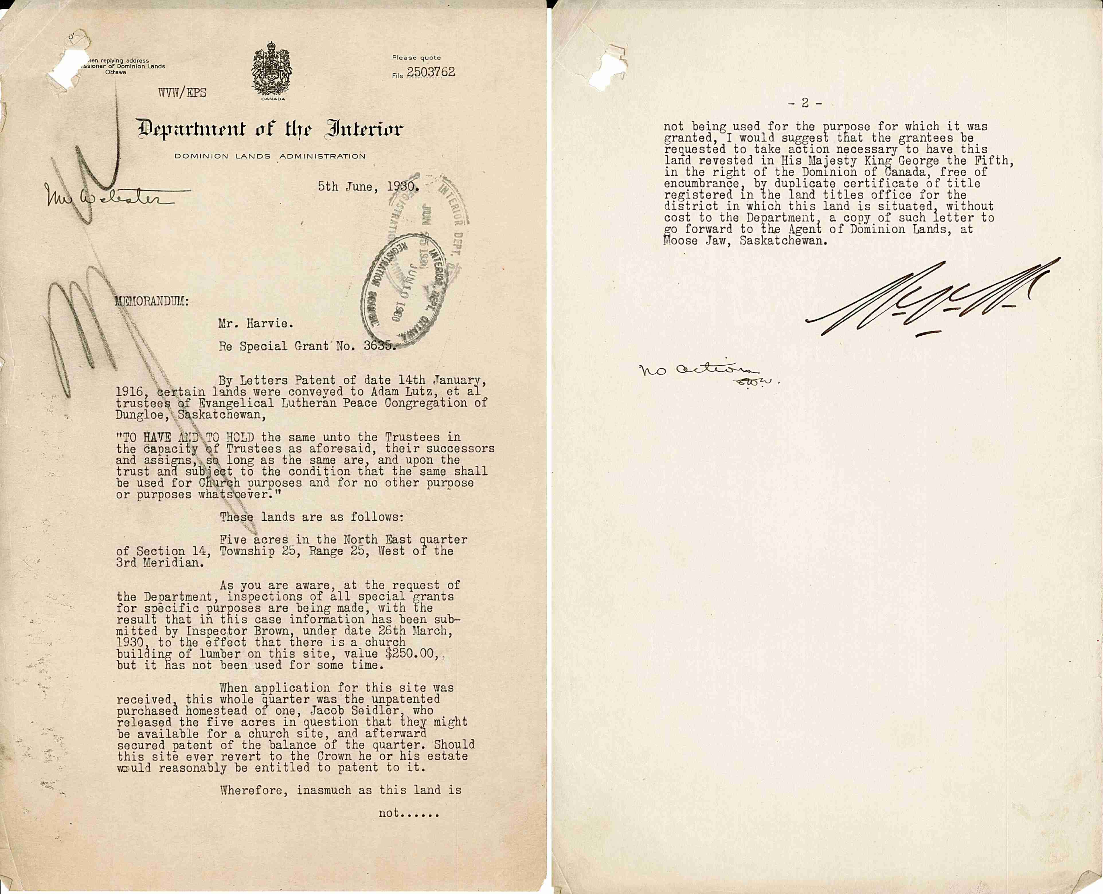 1930-Jun-05: The church & land is no longer being used for the purpose for which it was granted.