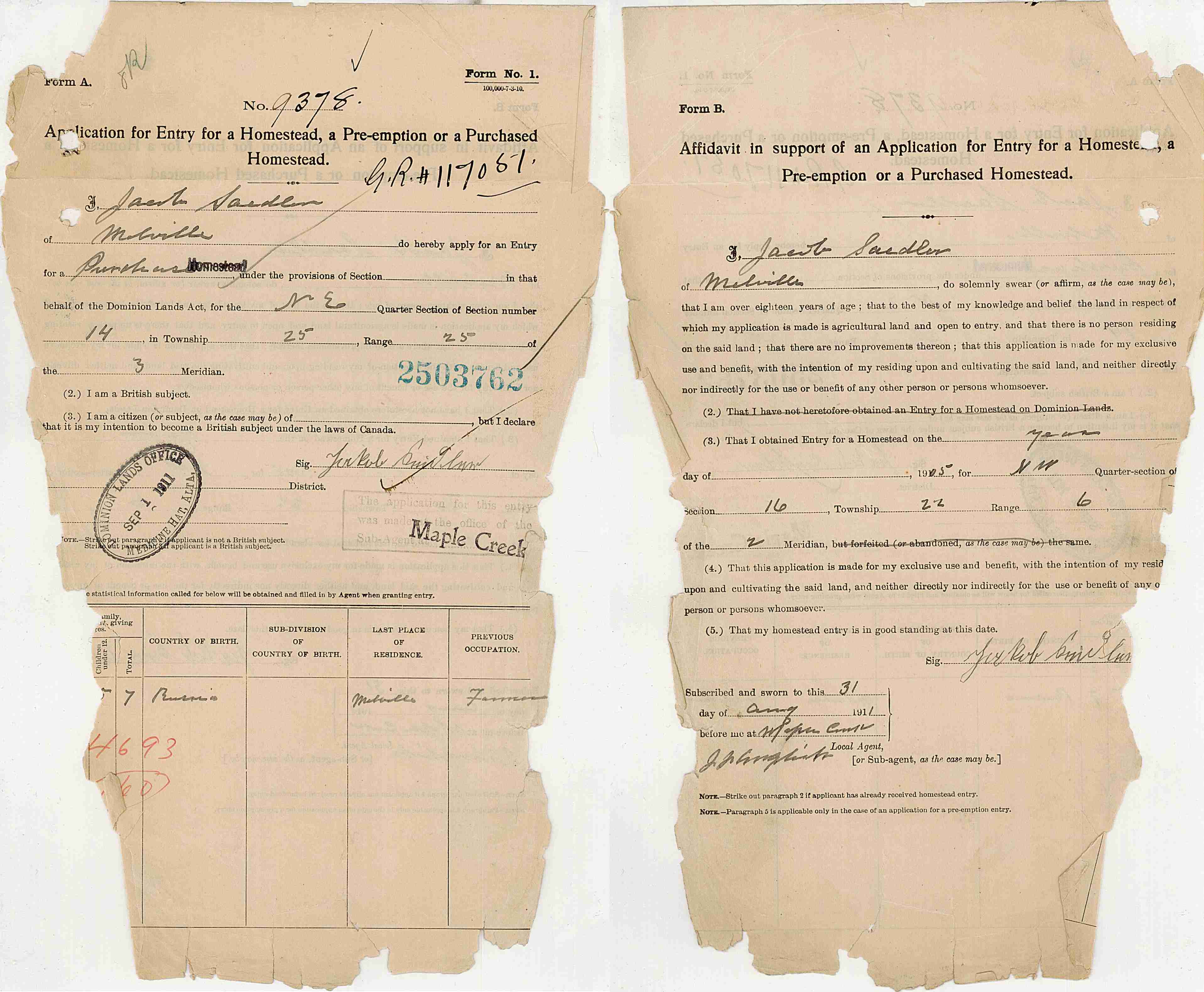 1911-Aug-31: Jacob Seidler applied for Homestead entry for NE-14-25-25-W3. 1911-08-31 Seidler, Jacob, Homestead Entry Application NE-14-25-25-W3.jpg