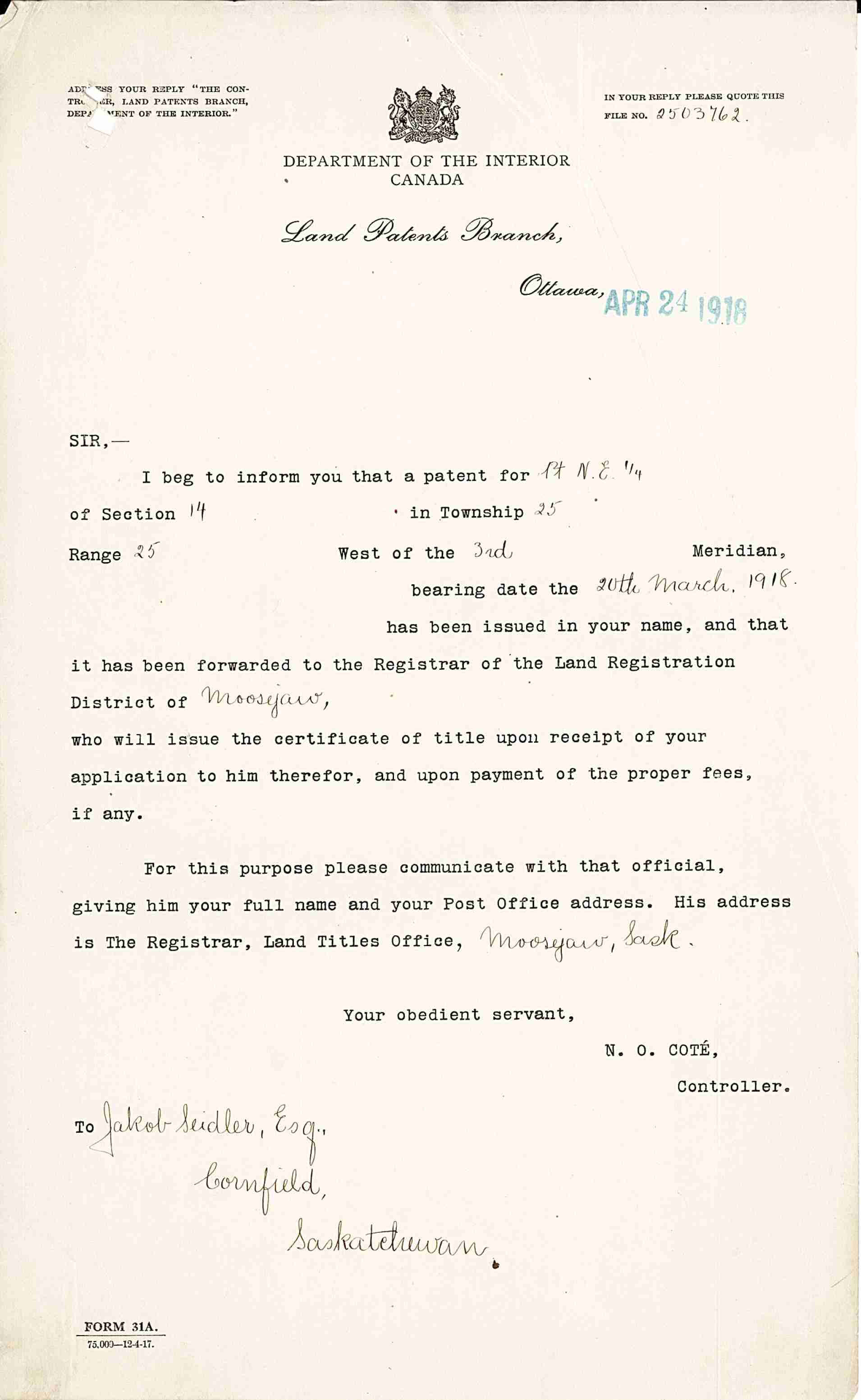 1918-Mar-20: Jakob Seidler Homestead Patent Grant for NE-14-25-25-W3.